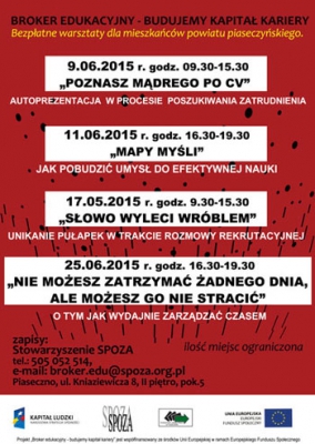 Zapraszamy osoby dorosłe mieszkające, pracujące lub uczące się w powiecie piaseczyńskim do udziału w bezpłatnych warsztatach realizowanych w ramach projektu "Broker edukacyjny - budujemy kapitał kariery".