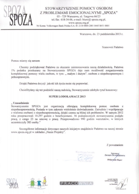 WSZYSTKIM, KTÓRZY PRZEKAZALI 1% PODATKU NA RZECZ STOWARZYSZENIA "SPOZA" JESTEŚMY BARDZO WDZIĘCZNI. DZIĘKI TEMU WSPARCIU TRWAMY I ROZWIJAMY SIĘ NADAL.