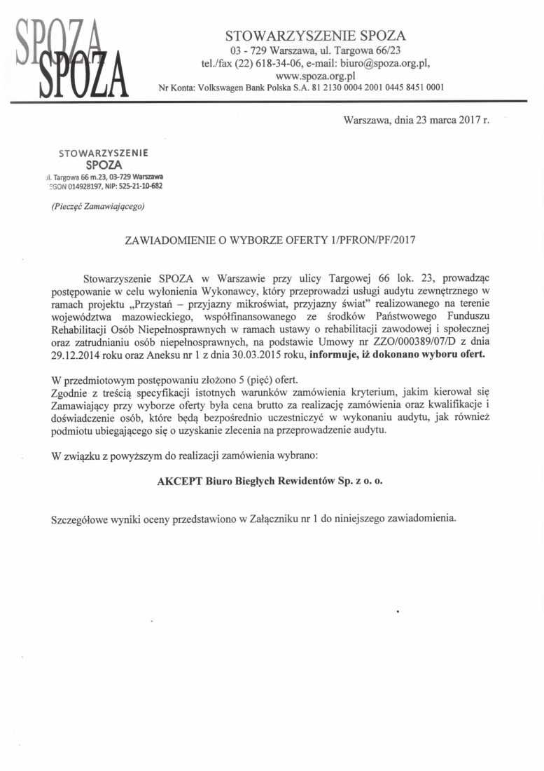 W związku z realizacją przez Stowarzyszenie SPOZA projektu „Przystań – przyjazny mikroświat, przyjazny świat”, realizowanego na terenie województwa mazowieckiego, współfinansowanego ze środków Państwowego Funduszu Rehabilitacji Osób Niepełnosprawnych w ramach ustawy o rehabilitacji zawodowej i społecznej oraz zatrudnianiu osób niepełnosprawnych, zgodnie z obowiązującą zasadą konkurencyjności, Stowarzyszenie SPOZA informuje, iż dokonano wyboru najkorzystniejszej oferty.