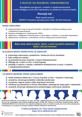 - są prowadzone przez trenerów mających duże doświadczenie w pracy z osobami z niepełnosprawnością, a także w prowadzeniu szkoleń
