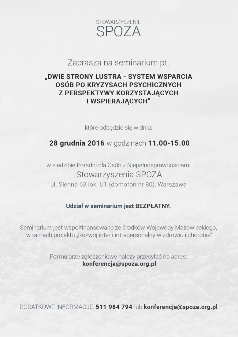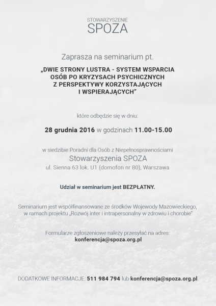 Stowarzyszenie SPOZA serdecznie zaprasza na seminarium pt. „Dwie strony lustra - system wsparcia osób po kryzysach psychicznych z perspektywy korzystających i wspierających”, które odbędzie się w dniu 28 grudnia 2016 w godzinach 11.00-15.00 w Warszawie.