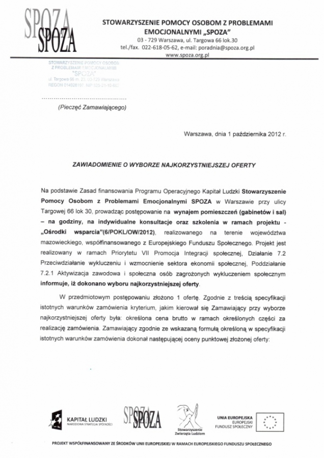 W związku z realizacją przez Stowarzyszenie Pomocy Osobom z Problemami Emocjonalnymi SPOZA projektu „Ośrodki wsparcia”, współfinansowanego ze środków Unii Europejskiej - Europejskiego Funduszu Społecznego - w ramach Programu Operacyjnego Kapitał Ludzki, Priorytetu VII Promocja Integracji społecznej, Działanie 7.2 Przeciwdziałanie wykluczeniu i wzmocnienie sektora ekonomii społecznej, Poddziałanie 7.2.1 Aktywizacja zawodowa i społeczna osób zagrożonych wykluczeniem społecznym, zgodnie z obowiązującą zasadą konkurencyjności, Stowarzyszenie SPOZA ogłasza zapytania ofertowe o przedstawienie ofert cenowych dotyczących wykonania zamówień zgodnie z warunkami określonymi w niniejszym zapytaniu ofertowym.