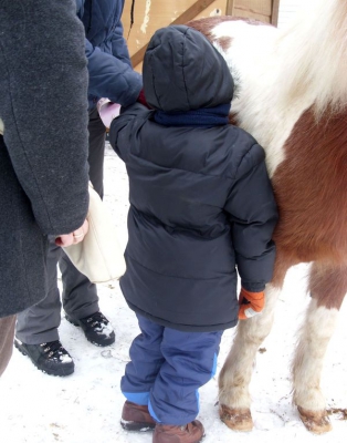 Pan rozpalił nam ognisko i pięknie opowiadał o przyrodzie. Pani pokazała stajnie, czapeczki do jazdy na koniach (nazywają się toczki). Mogliśmy też czesać Pączka i Bączka dwiema specjalnym szczotkami. Rodzice popijali herbatkę, a dzieci dostały jedzonko. Bardzo, bardzo miły, zimowy dzień.