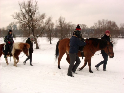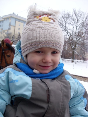 Dziś poszliśmy na konie. Nigdy nie byłem na koniach w zimie. Jest zupełnie inaczej. Tak mi się wydaje. Trzeba być grubo ubranym, wszystko dookoła wygląda inaczej. Tylko przyjemność jest taka sama :) Przyszło niewiele dzieci, bo w taką pogodę często się choruje. Ale za to, te osoby, które przyszły, mogły długo i daleko pojechać. Dostaliśmy dwa koniki: Pączka i Bączka. No hit!!! Takie imiona. Bączek był duży, a Pączek- mały, to kuc.