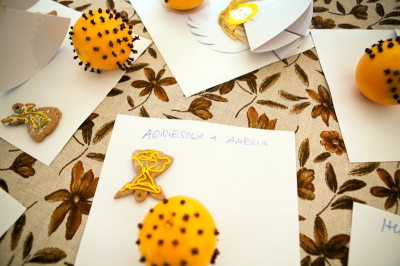 Kolejnym zadaniem było dekorowanie pierniczków takim kolorowym lukrem, który potem można zjeść. To była część konkursu. Niektórzy zrezygnowali ze startowania w nim i od razu zlizywali kolory. Ja wytrwałam. Potem, razem z rodzicami ozdabialiśmy pomarańcze takimi pachnącymi patyczkami- gwoździkami, które nazywają się goździki. Konkurs został rozstrzygnięty, nagrody rozdane.