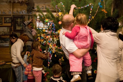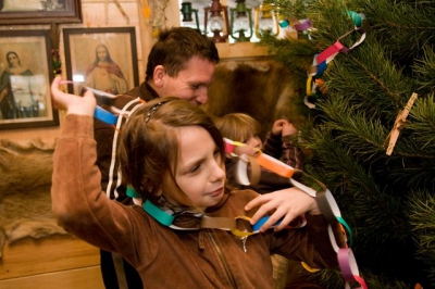 Całe szczęście, że na miejscu był wielki kominek, do którego można było zaglądać z czterech (czyli wszystkich) stron. Była też ogromna choinka, którą ubieraliśmy razem z mamami i tatami. Bombki i łańcuchy, którymi przyozdabialiśmy choinkę zrobiły nasze mamy na warsztatach, ale też trochę robiły dzieci, w swoich domach. Ja najbardziej lubię te pomarańczowe bombki- można potem oblizywać palce.