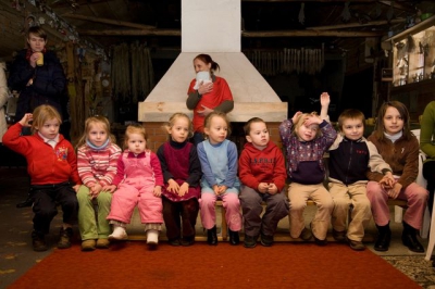 Prawie wszystkie Radosne Maluchy (Alberta i jego rodzeństwa nie było, bo mają ospę), ich siostry, bracia i rodzice pojechali na Wigilię. To była taka wcześniejsza Wigilia, bo przecież nie mogliśmy się spotkać w ten sam dzień, w którym mamy Święta w naszych domach. Tym razem pojechaliśmy do miejsca, które nazywa się Zaścianek Mazowiecki. To był dzień, w którym było bardzo, bardzo dużo śniegu. A gdy się wyjechało z Warszawy, to ten śnieg był jeszcze bardziej biały. Był też wielki mróz i niektórym z nas było zimno w nogi.