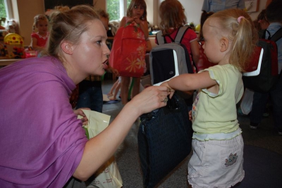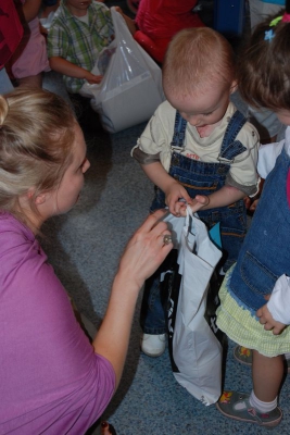 Potem, każdy, kto już kończy przedszkole i od po wakacji idzie do prawdziwej szkoły, albo do innego przedszkola dostał specjalny prezent. Plecak. A w środku były buty, koszulki, zeszyty, piórniki, maskotki, flamastry, kredki, kleje i dużo innych rzeczy, które podobno się przydają w szkole.